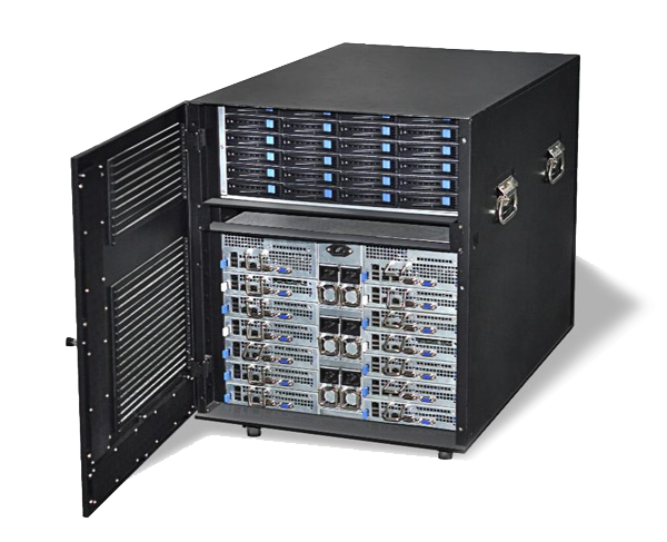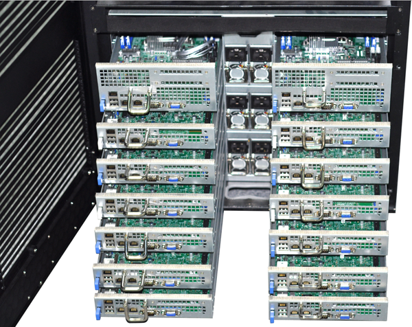 凯发K8天生赢家一触即发融合一体机就是解决环境使用问题而推出的综合性计算产品,它不需要专业的机房设施,不需要专业的配电和空调设备,放在办公室或实验室接墙电就可使用, 具有低噪音、低功耗等特点。最高可以安装14个双路XEON E5 处理器的刀片服务器,48个外置热插拔硬盘存储,内置一个万兆网络交换机安装空间,带有整体状态显示和控制系统,内部散热和防尘处理。专为办公室应用环境 设计,它在众多方面超越了传统机架式服务器、刀片服务器和机群服务器,是高稳定、高性能、低环境要求的新一代桌边型高性能计算机。它采用整体优化的设计, 有效降低了系统功耗,再加上其人性化的设计、很强的系统扩展能力、卓越的性价比和计算密度,可以覆盖更广泛的个人及工作组用户对高性能计算的需求,与传统 的高性能计算机相比,凯发K8天生赢家一触即发融合一体机可给予更有竞争力的整体解决方案,是更好满足中小高性能计算需求的理想平台。下图为14个刀片打开效果图: