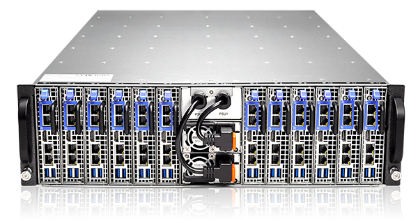 凯发K8天生赢家一触即发的S312-S24R刀片服务器集群系统3U机箱内包括12个E3 处理器刀片服务器,单个处理器带有2个视频处理核心,单个刀片可配置64G内存,2个6TB硬盘,整个系统可配置144TB存储容量,对建立基于云或 hadoop技术的视频处理系统,具有极高的性价比。服务器内部结构如下: